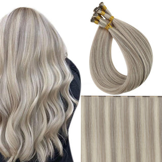 fullshine hair extensions, ash blonde hair, blonde highlights, balayage blonde mix, gray blonde tones, hand tied wefts, virgin human hair, real hair extensions, 20 inch length, natural blend, cool tone hair, luxury hair bundles, heat safe styling, seamless install, cuticle aligned, lightweight hair, for daily and event wear, soft silky texture